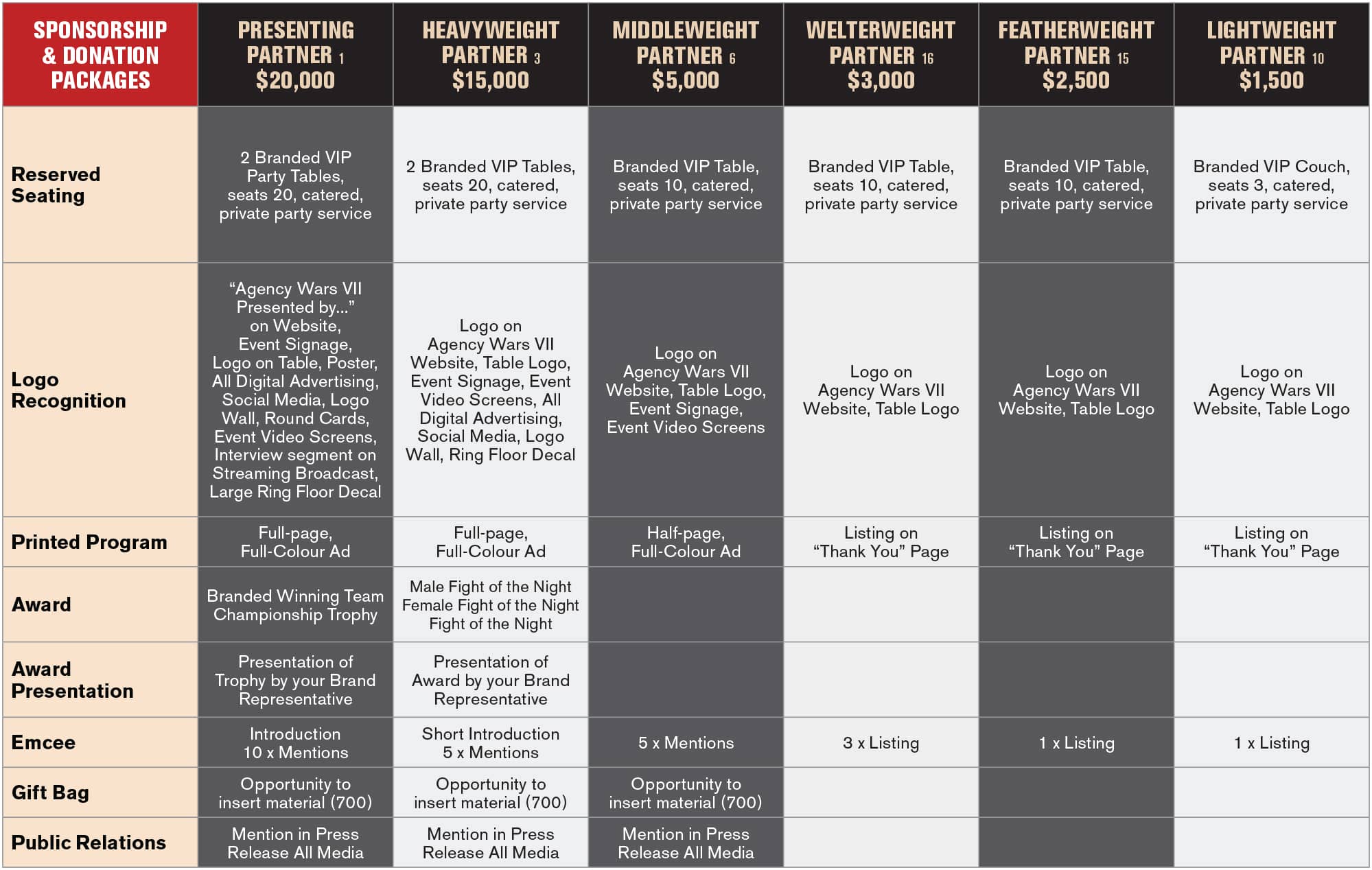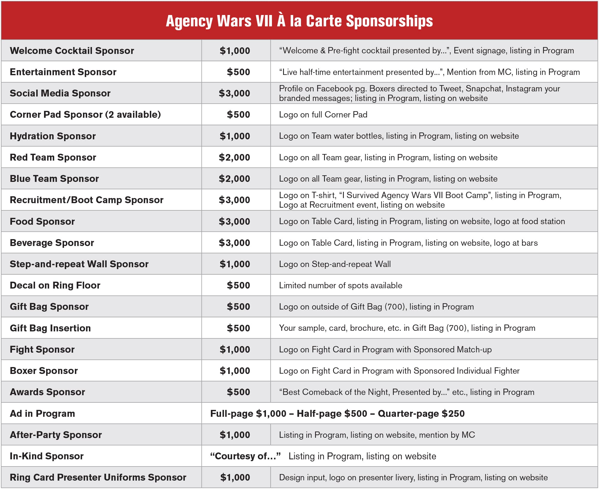 A variety of sponsorship opportunities are made available to the Agency, Marketing, and Media industries: signage, team sponsorships, logos on ring floor, fight presenters, award presenters, logo on corner pads, bag drop at tables, ad space in the program, after party sponsor, etc.